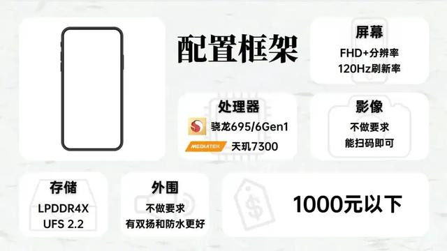 百元机推荐搭载骁龙695、骁龙6Gen1或者天玑7300或更高级别处理器的机型,像骁龙4Gen1、天玑6080我觉得可以不用考虑了,性能不太够了。看看这个框架有什么产品吧。