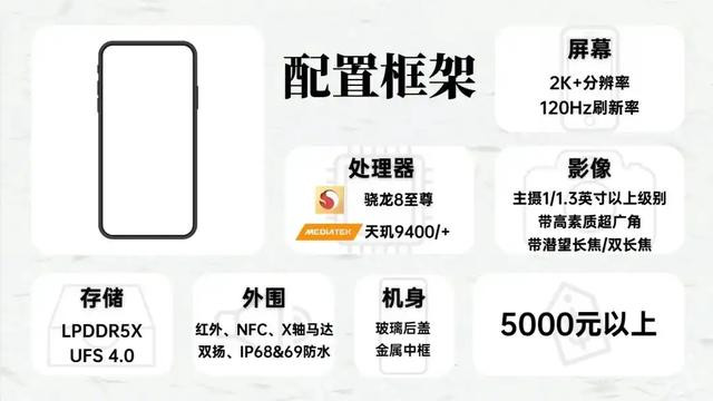 来看看Ultra级别手机的配置框架,屏幕均升级为2K+分辨率,影像方面,超广角镜头也上了大底CMOS,长焦则是各有所长,有的上大底潜望,有的上多颗长焦镜头。