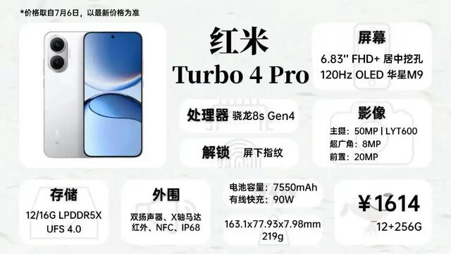 红米Turbo 4Pro正面采用超窄边框大R角设计,搭配一块华星M9材质的高素质屏幕,乍一看还以为是iPhone 16Plus,中框升级为金属材质,7550mAh的电池保证了良好的续航表现,需要长续航手机可以考虑这款。