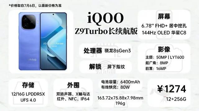 iQOO Z9Turbo长续航版和Z9一样,搭载华星C8材质直屏,屏幕素质不错,主摄升级到LYT600,在1200多的价位中性价比较高。