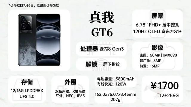 真我GT6的外围配置相当不错,IMX890和IMX906差不多,比IMX882、LYT600这些高一个级别。除此之外,它还拥有京东方S1+屏幕,120W的有线快充,除了电池容量较小,其余配置也没啥毛病。