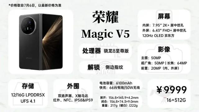 大折叠我个人推荐Magic V5,这款可以说是目前堆料比较猛的大折叠机型,骁龙8至尊、潜望长焦、无线充电、防水(防尘等级差点,但防水没问题)、无线充都给你安排上,重量和厚度控制也不错(217g,展开后4.1mm)。对比vivo X Fold 5,性能有优势;对比Find N5,重量和影像有优势。