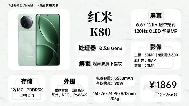 红米K80现在价格也不错,整体定位比Turbo 4 Pro高一档,更高级的影像,同价位唯一2K+分辨率屏幕,唯一搭载超声波屏下指纹,如果不追求极致的续航表现,我觉得K80比Turbo 4 Pro更值得选。