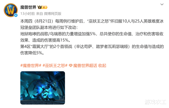 本周的削弱其实跟上周的预测有点出入,上周的时候农工觉得这周应该会针对于五区的BOSS进行削弱,这轮削弱之后魔兽世界WLK怀旧服HICC团本彻底成为了便当团,但是目前来看官方相对来说比较克制不对五区BOSS进行削弱,但是不确定下周好不好削弱,只要削弱巫妖王那么HICC就会进入到全民便当团的时代。