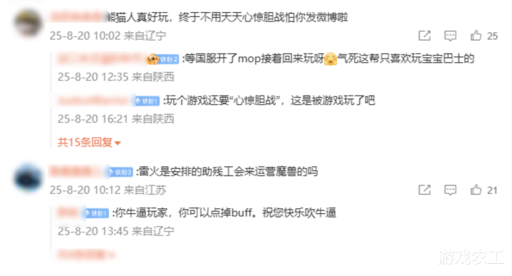 不过也有人留言表示熊猫人真好玩,终于不用天天心惊胆战怕你发微博啦,但是也有人怼回去说玩个游戏还要“心惊胆战”,这是被游戏玩了吧。不过目前来看国服的熊猫人怀旧服应该也会在不久的将来开服,而国服目前的运营策略其实就很简单,高高举起慢慢放下,通过前期的原生难度,让玩家们体验到开荒的感觉,之后缓慢削弱难度来增加玩家们的参与团本的热情。